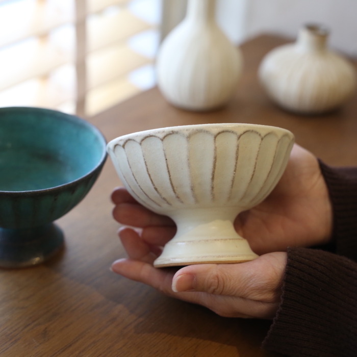 多肉植物をあしらった脚つきカップは、益子焼 わかさま陶芸さんのデザートカップ。