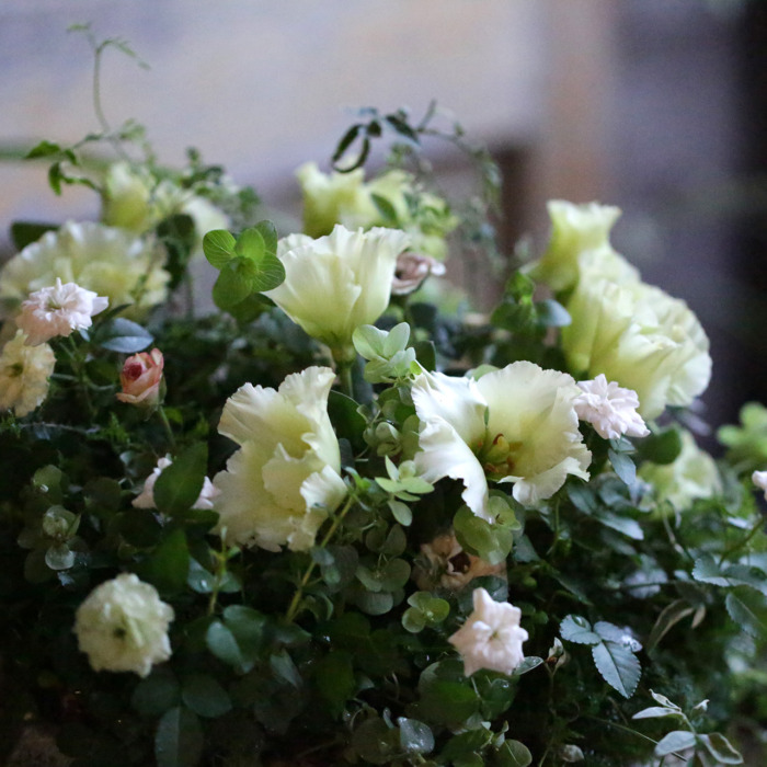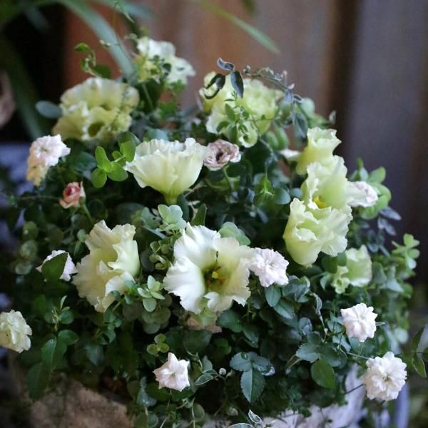 イエローグリーンのトルコキキョウやミニバラグリーンアイスが見ているだけで爽やかな気分に♪