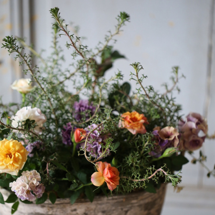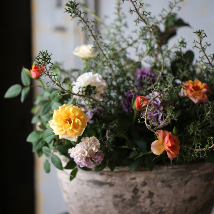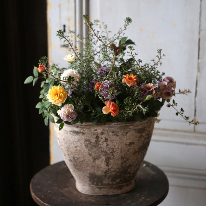 フリルが大きなパンジーとオレンジのミニバラの可愛らしいブリコラージュです。クリスマスローズも後ろから顔を出しています。器を抱えるとまるでブーケを持った様な華やかな一鉢になります。