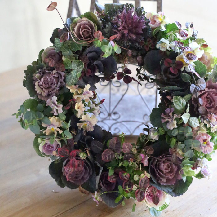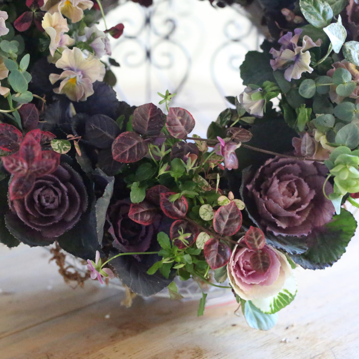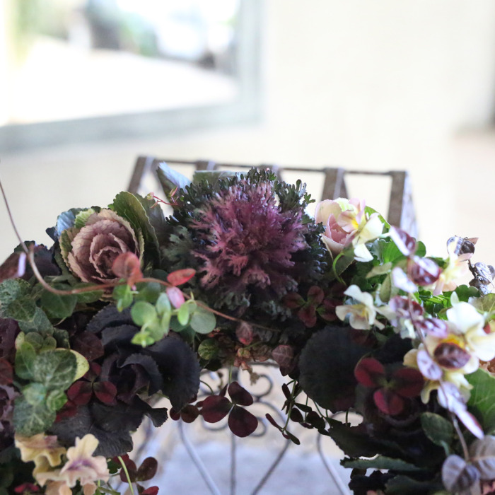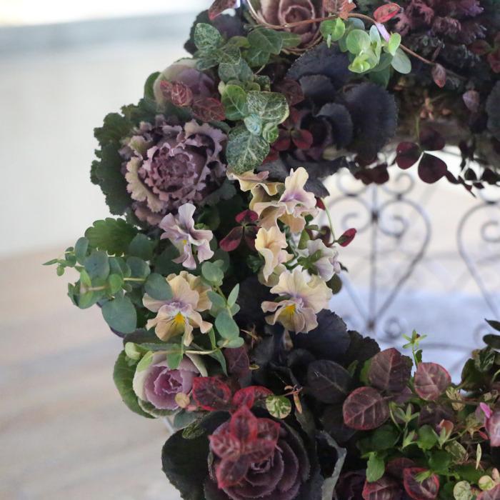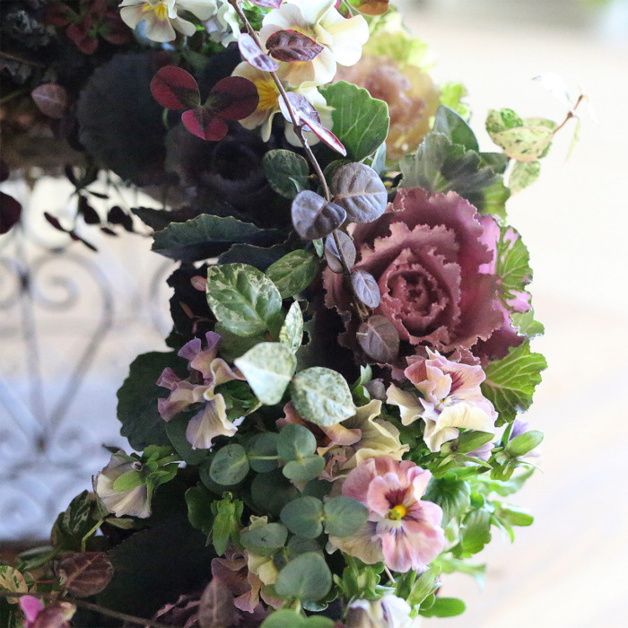 アンティークカラーの葉ボタンとビオラを合わせ、シックな雰囲気に仕上げました。