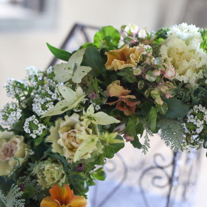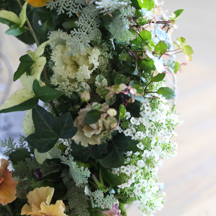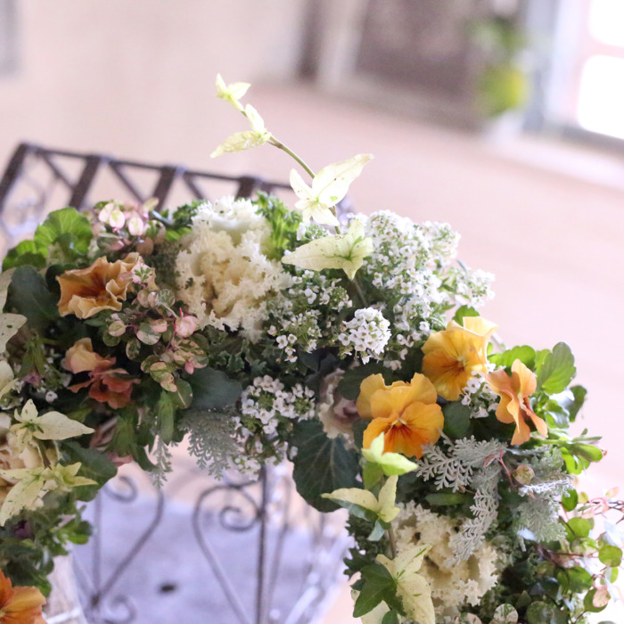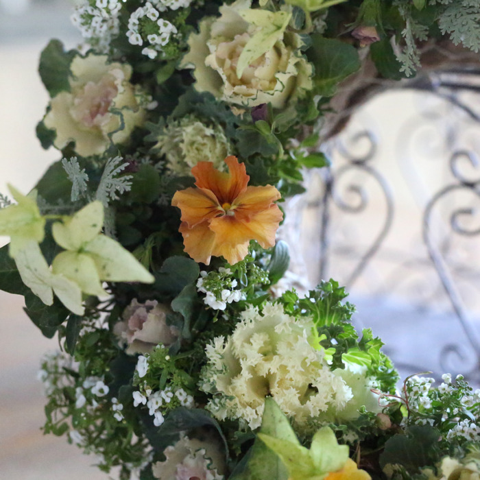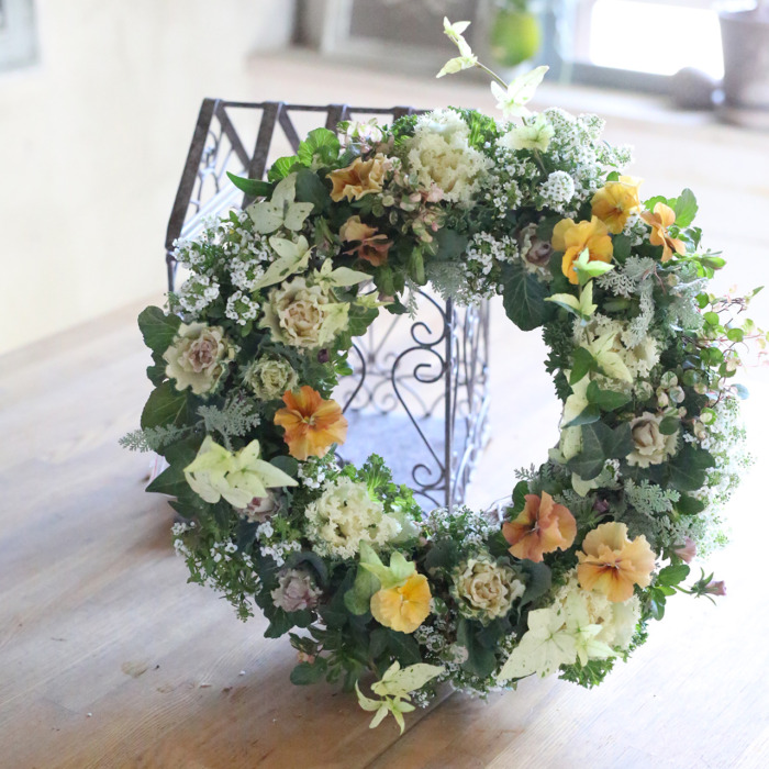 イエロー系のパンジー華もみじとホワイト系の葉ボタンを合わせ、ビタミンカラーのリースが出来ました。