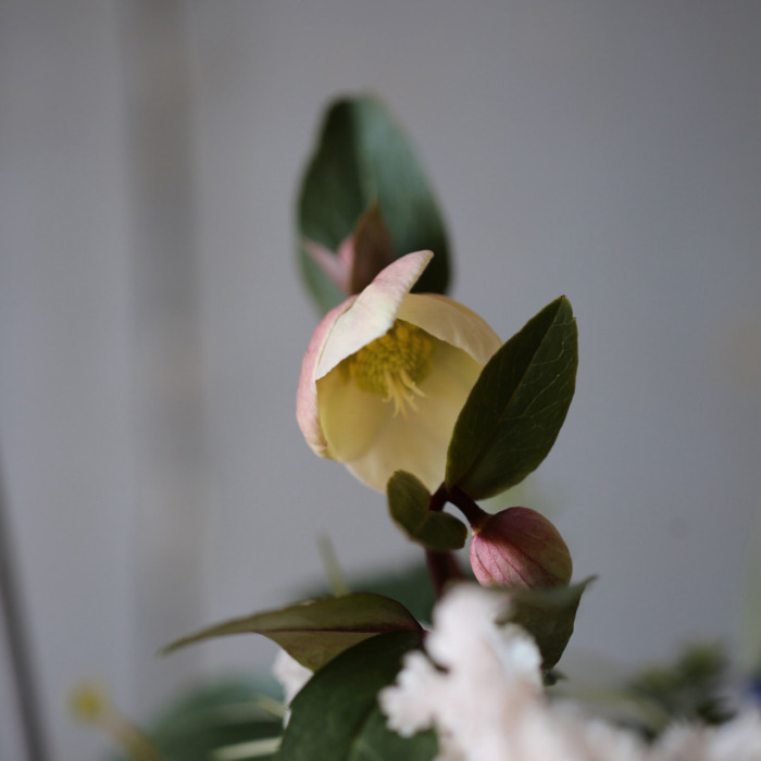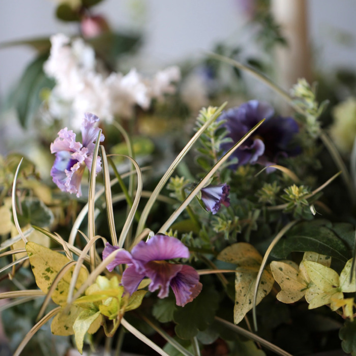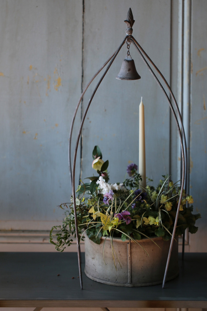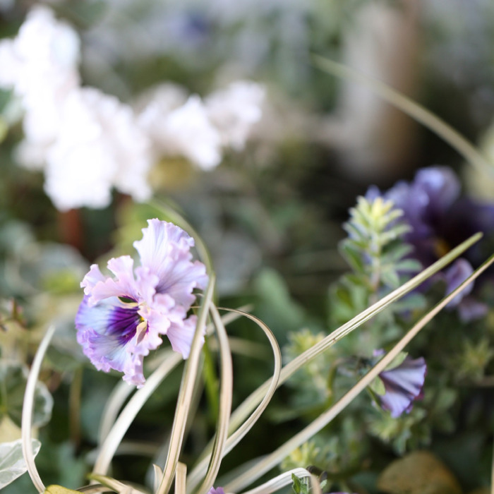 白いフリルの花びらが可愛らしいシクラメンと、儚いブルーカラーが美しいビオラ「レディ」のブリコラージュフラワーです。ベル型のトレリスを被せ、寒い冬の中で凛とした美しさのある一鉢です。
