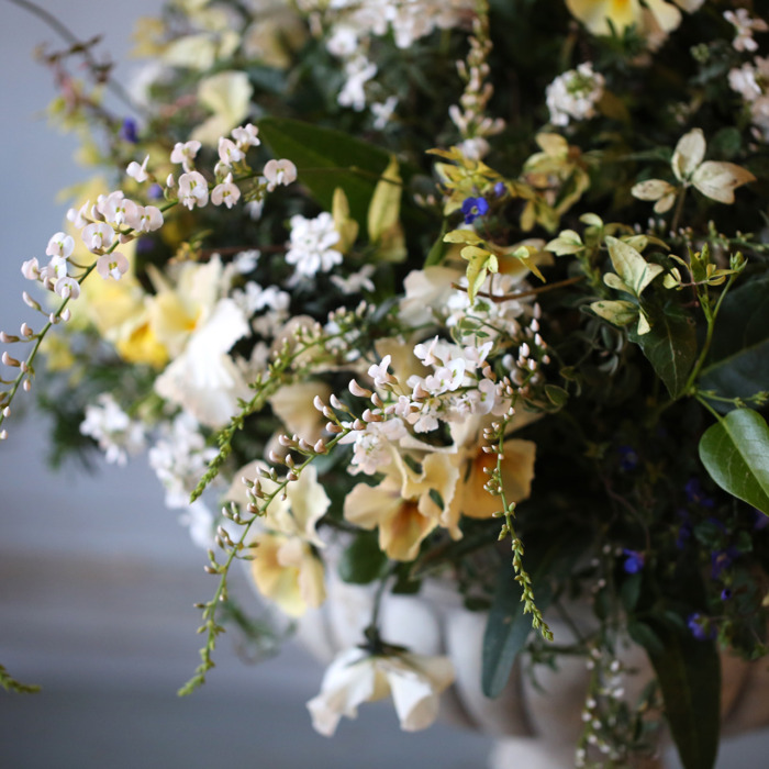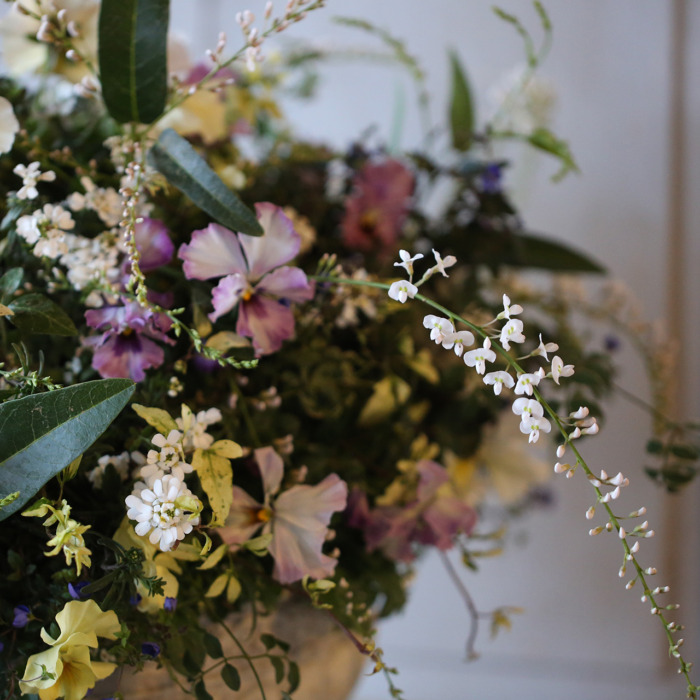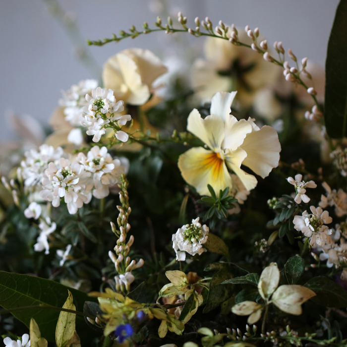 透き通ったような花色を引き立てる白いハーデンベルギアやイベリス、ブルーの小花のベロニカがアクセントとなって、多摩の舞のふわふわしたイメージを引き出した包み込まれるような優しい作品に仕上がりました。