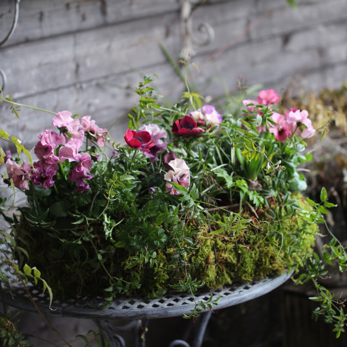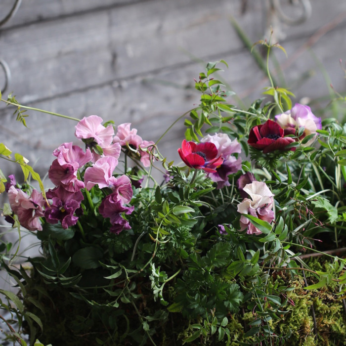 アーチ型アイアンの器に苔と美しい色合いの秋田緑花農園育種パンジーを植え込んだナチュラルさあふれるブリコラージュです。