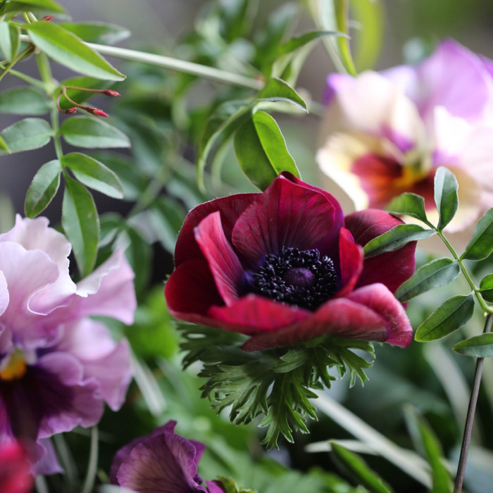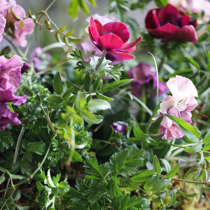 動きのあるジャスミンと深い色味のアネモネや蕾の可愛らしいヒヤシンスもお楽しみください。