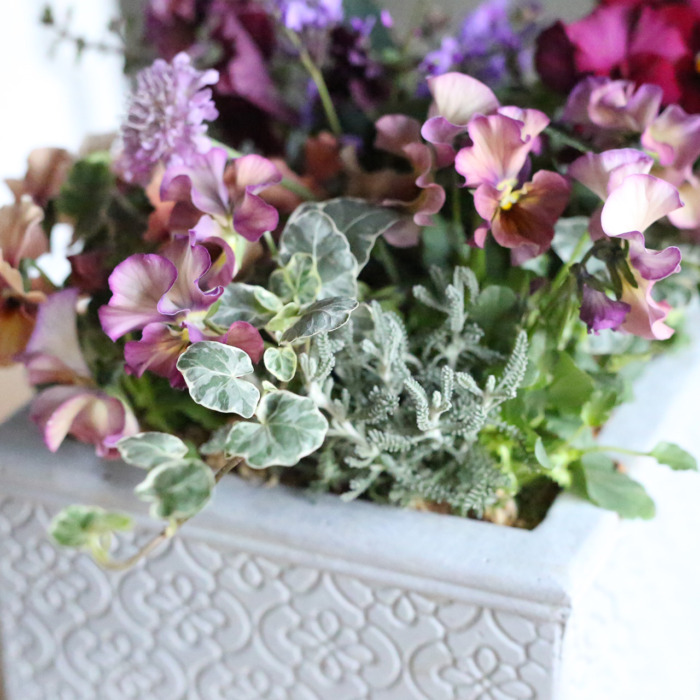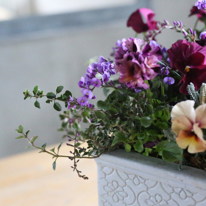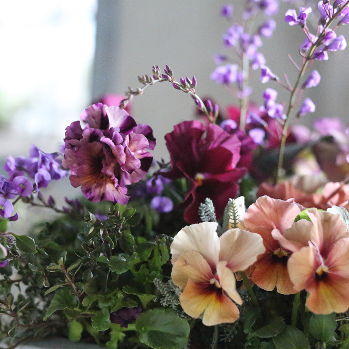 ハーデンベルギアに春のお花達を合わせました。アプリコットと赤系のビオラが陽だまりの暖かさを感じさせてくれますね。