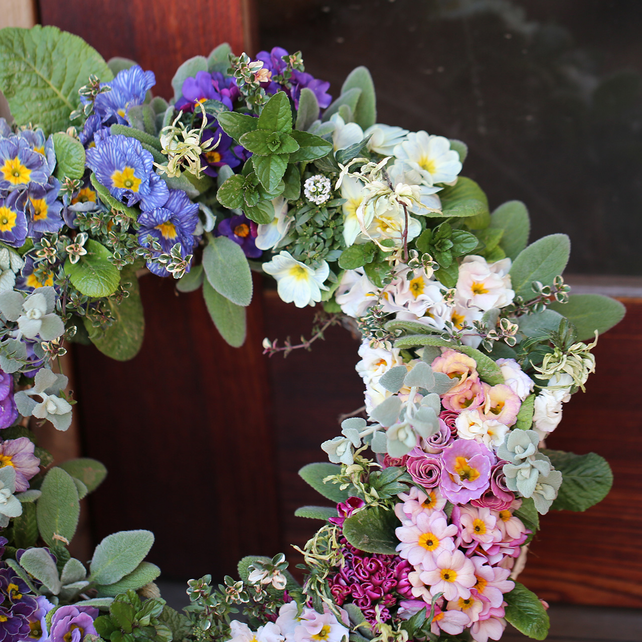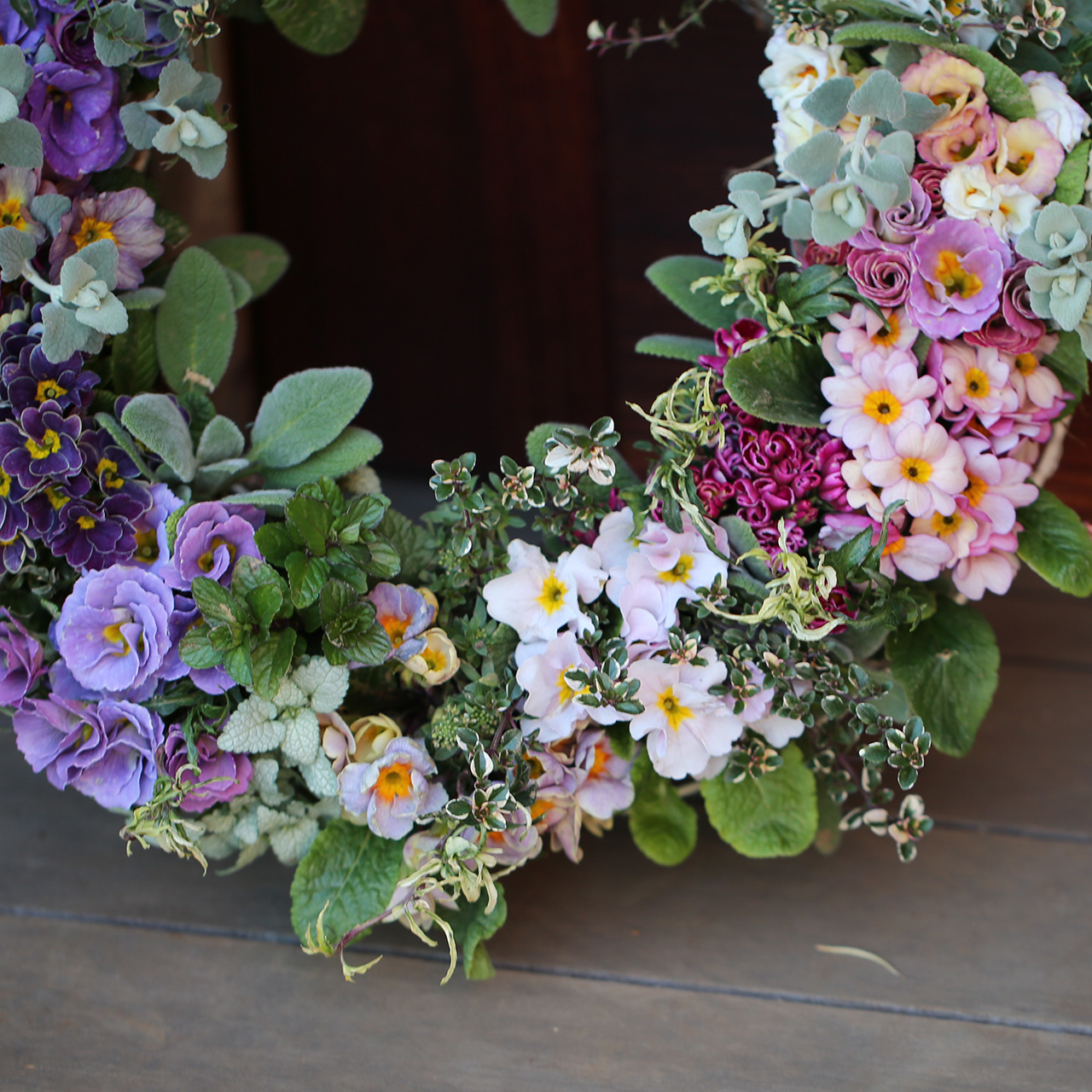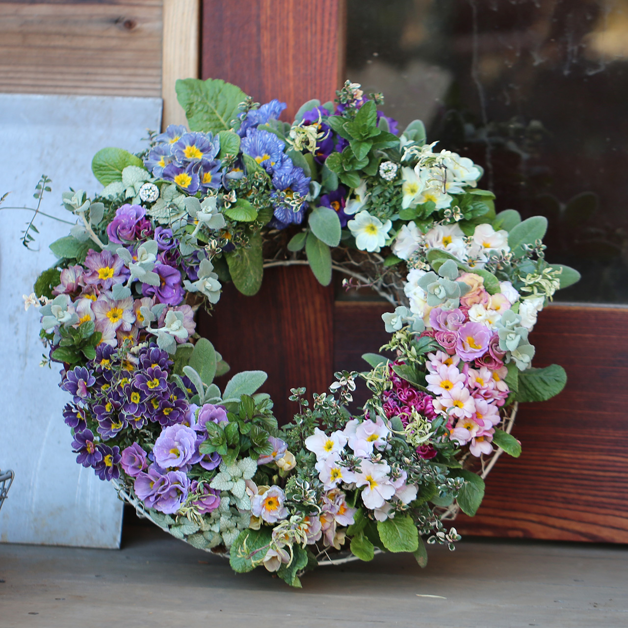 アンティークな色合いのジュリアンをたっぷり使ったリースです。春の訪れを告げる霞模様のような、柔らかな春をイメージさせる色を繊細に重ねたグラデーションが魅力。