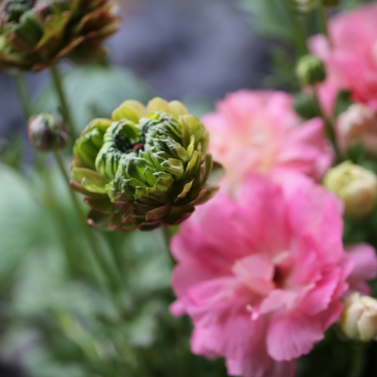 可愛らしいピンクのラナンキュラスと形の面白いラナンキュラスアラクネJr.を合わせました。パステルピンクの春らしい色合いをお楽しみください。